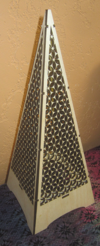 A new desk light or a new blinky thing? I call this creation the Pyramid Light. A beautiful laser cut pyramid with a delicate pattern motif. See image below for a close up. The pyramid was made from 1/8" Baltic Birch. Assembly of this item was a real pain. So much so that I will probably never make another one. One and done as they say. A small wattage light bulb could be placed inside the pyramid for use as a regular light or a blinky device using a ESP32 and NeoPixels could light up the pyramid with colorful patterns. Which do you think I chose? |